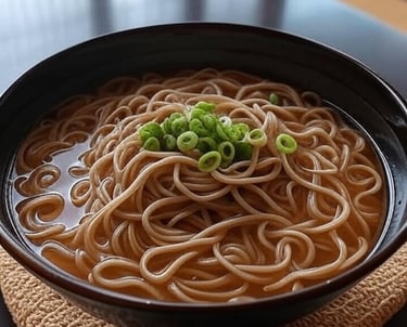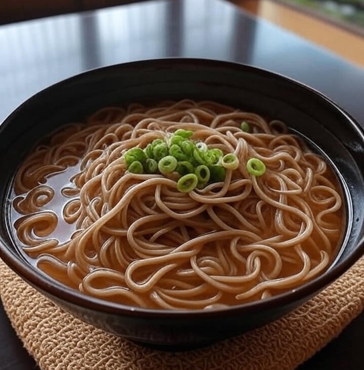 Kake Soba: Warm soba in a light dashi broth with soy sauce and mirin, topped with scallions—ideal for a quick, soothing meal.